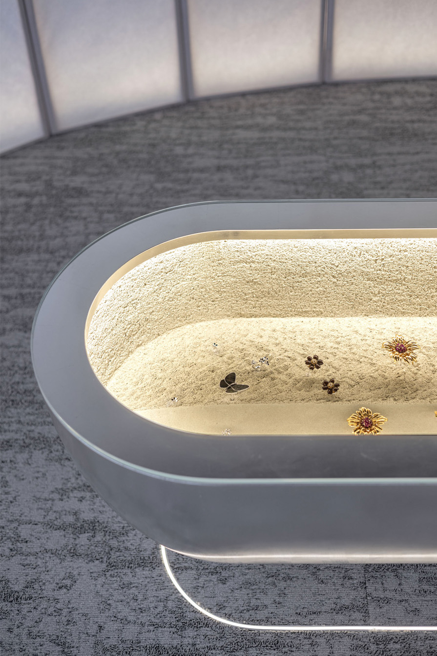 由緒ある下鴨神社の細殿の中に厳かな雰囲気が漂う展示スペースとなりました。曲線を描く和紙の空間からは柔らかな光が全体を覆います。その中には小舟のようなショーケースが光を纏って浮かんでいます。ショーケースの中は左官によってデザインされ宝石に輝きと物語を感じさせてくれます。
